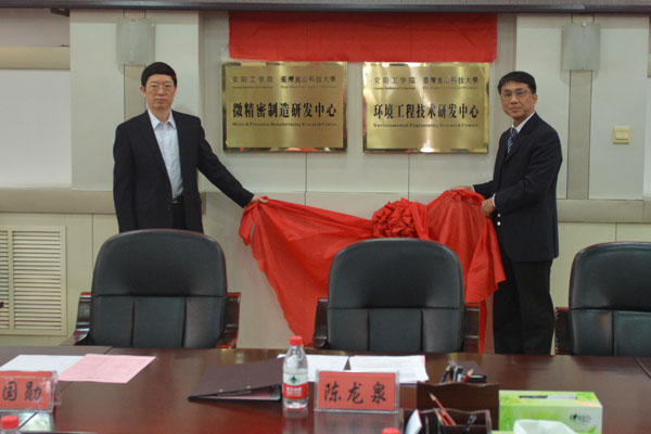 4月7日上午,我校与台湾昆山科技大学联合共建的“微精密制造研发中心”和“环境工程技术研发中心”揭牌仪式在行政楼二楼会议室举行。台湾昆山科技大学进修推广处处长陈龙泉、微精密制造中心主任于剑平、我校校长景国勋、副校长李学志出席,校长办公室、教务处、科研处、国际合作与交流处、机械工程学院、化学与环境工程学院等部门负责人参加。仪式由副校长李学志主持。